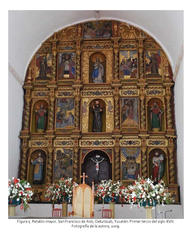 A lo largo de casi tres siglos, la orden franciscana mantuvo el derecho exclusivo de evangelizar la península de Yucatán, lo que dio origen a una arquitectura y arte sacro con características peculiares que se manufacturó hasta finales del siglo XVIII. El arte en especial estuvo condicionado a los pocos recursos económicos y materiales con que contaba la región, pero sobre todo a los acontecimientos históricos que permitían el avance misionero o lo limitaban, tal como fue el caso del proceso de secularización, las continuas plagas, epidemias, hambrunas y las huidas de los mayas a territorios indómitos. Por ello, ante la ausencia de investigaciones sobre este tipo de piezas que poblaron las iglesias administradas por la orden y su relación con los procesos históricos acaecidos, el presente artículo pretende proporcionar un primer acercamiento al análisis de cinco retablos que fueron auspiciados por los frailes durante la Colonia; esto con la intención de comprender qué soluciones se emplearon en su elaboración, el discurso aceptado y promovido a través de ellos, así como los modelos preferidos y su evolución estilística.